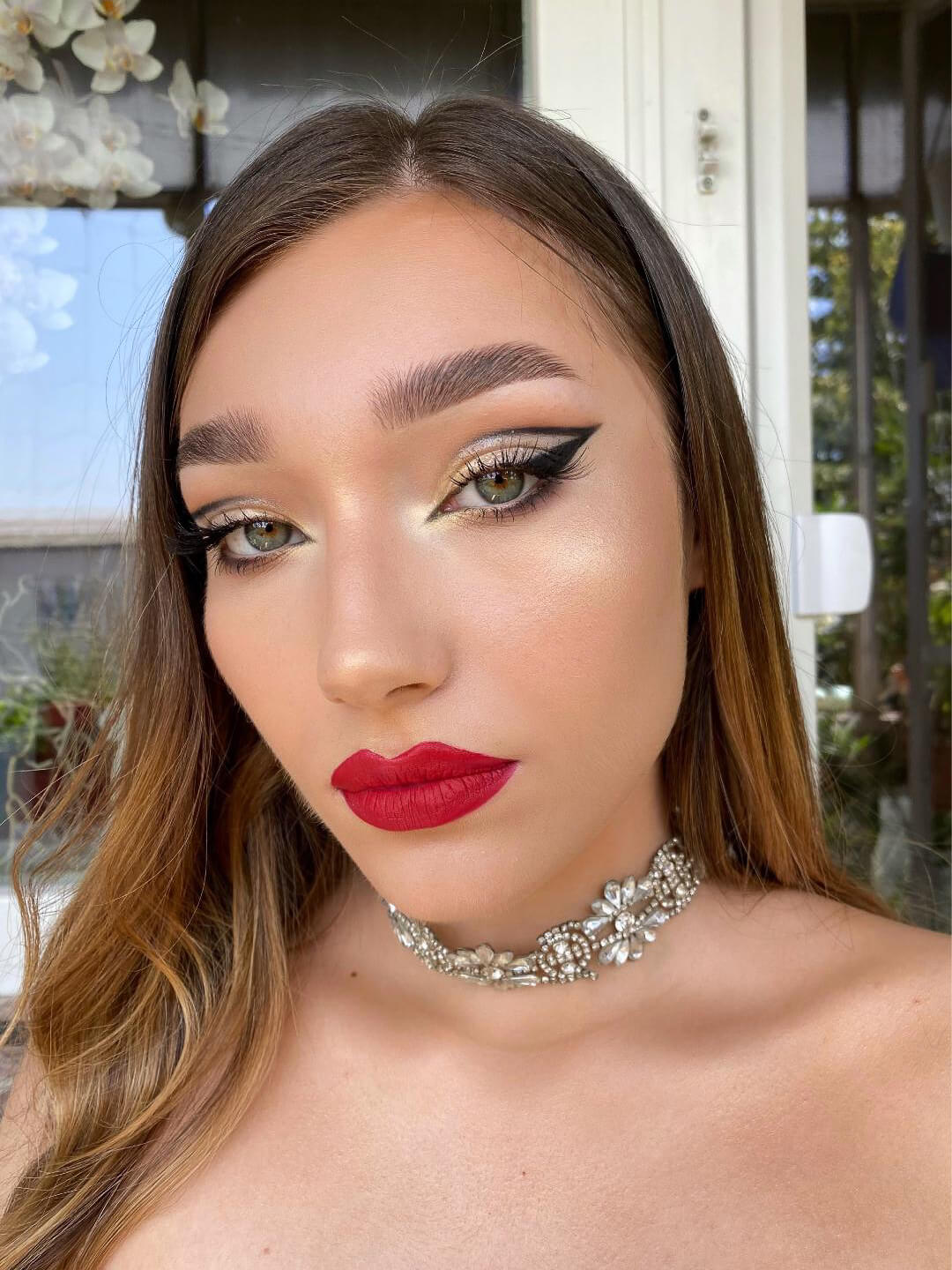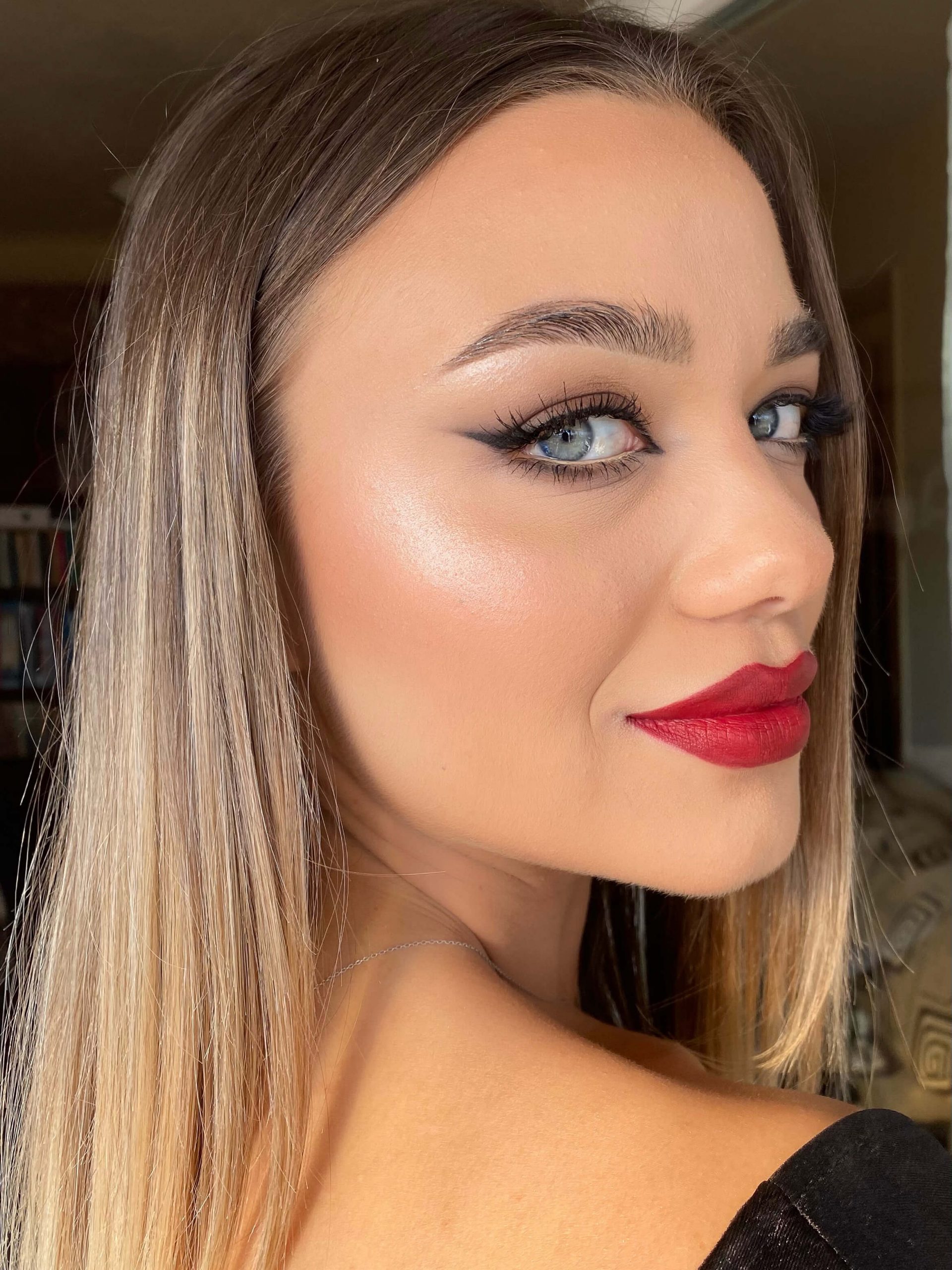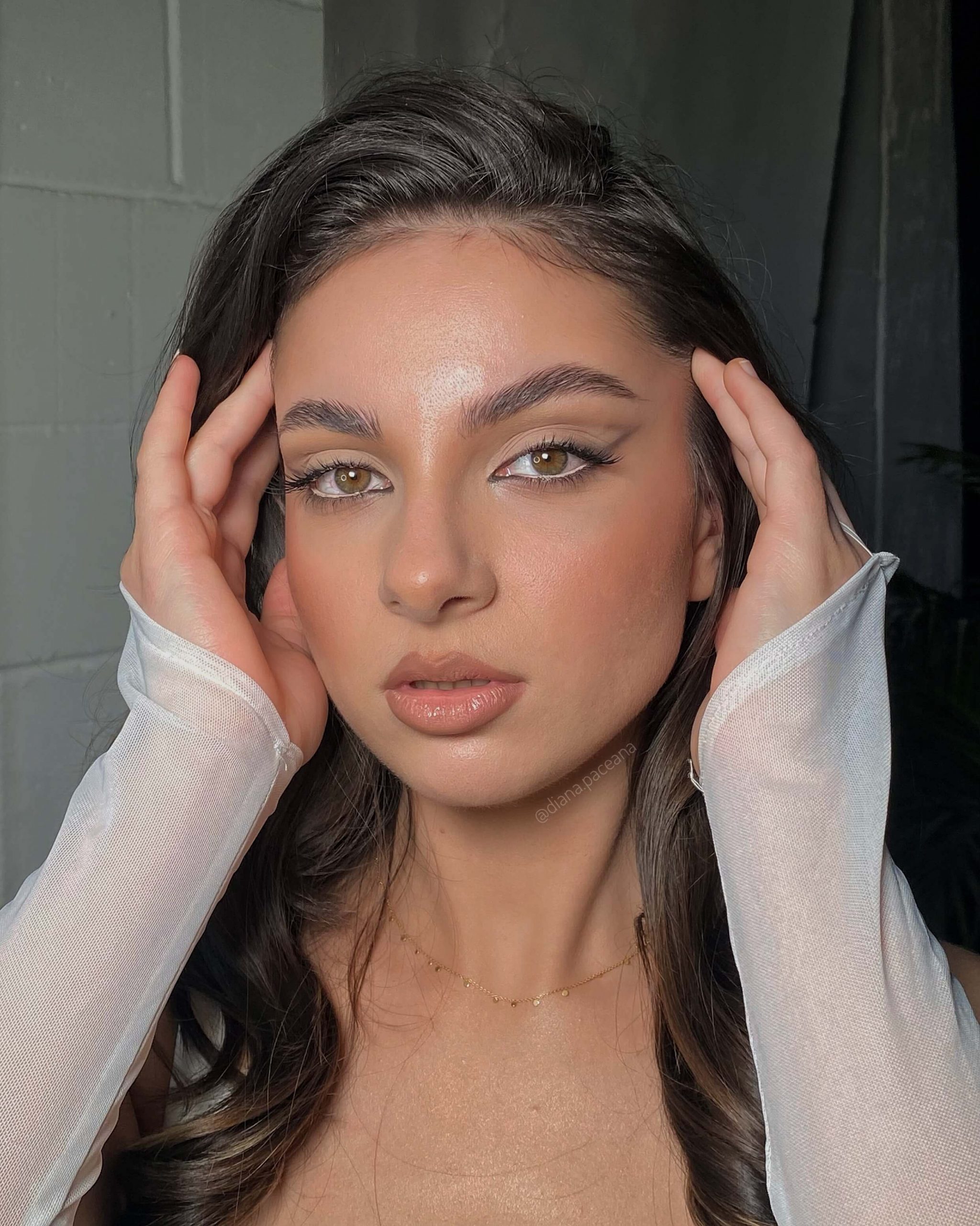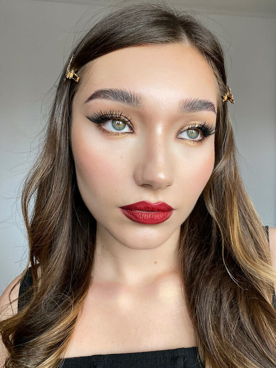 I typically recommend this version to clients that want to look natural, but an elevated version of themselves. Not over the top at all, and is often the least amount of makeup as far as glam goes. The infamous “no makeup, makeup look”. There is typically some contour and highlight, but just enough to accentuate your features, and natural-looking lashes, long and wispy. Eyeshadow is usually matte tones of browns and neutrals.